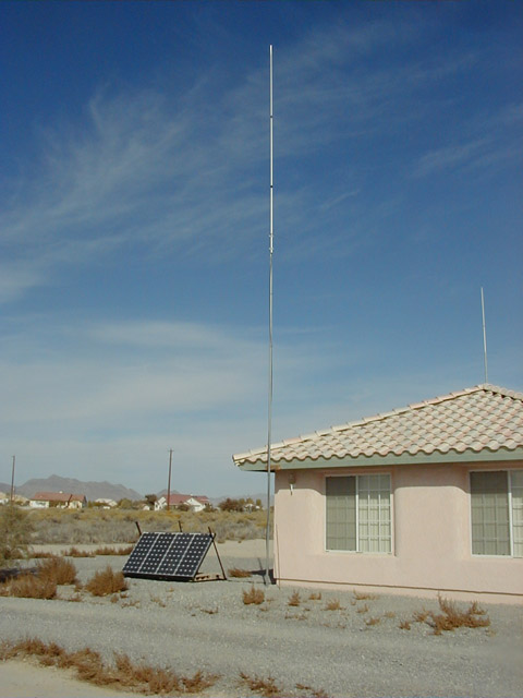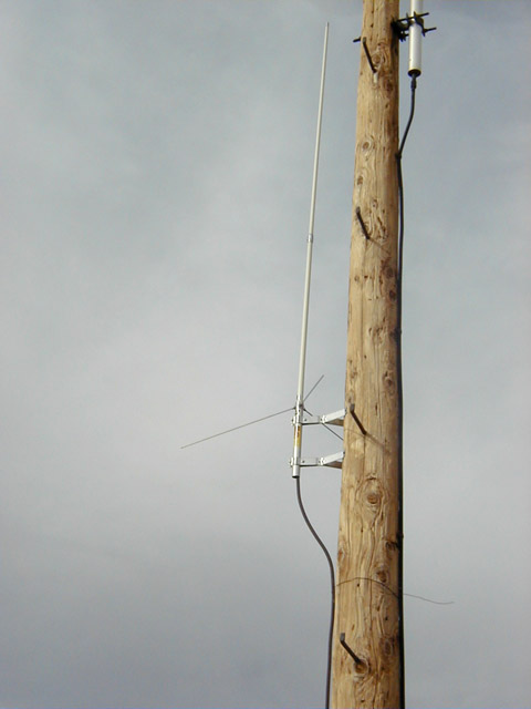 | The antenna for the amateur repeater is on the left side of this wooden pole. The antenna for the Sheriff's Department repeater is above us and on the right side of the pole; in this photo, only the base of the Sheriff's repeater can be seen; the radiating elements are higher. |