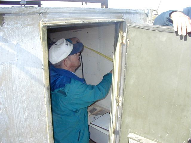 Inside the hut, Foster Paulis W4HCX measures for a shelf to hold our equipment.