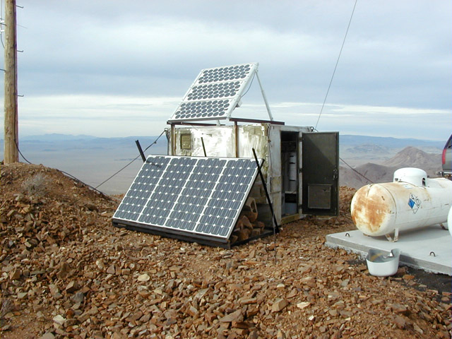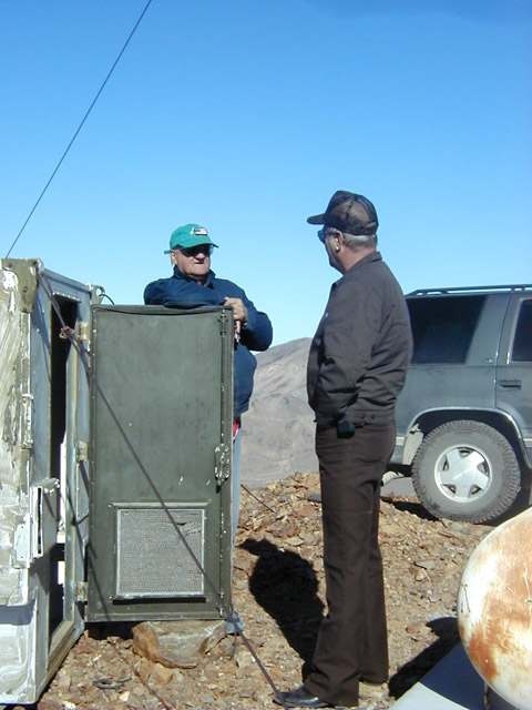 Standing by the open door of the equipment hut are Jim Tully N7ENB, leaning